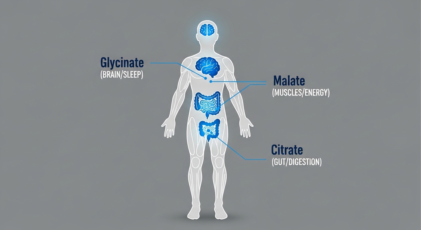 2. 글리시네이트는 불면증, 시트레이트는 변비, 말레이트는 근육통 완화에 특히 효과적입니다.